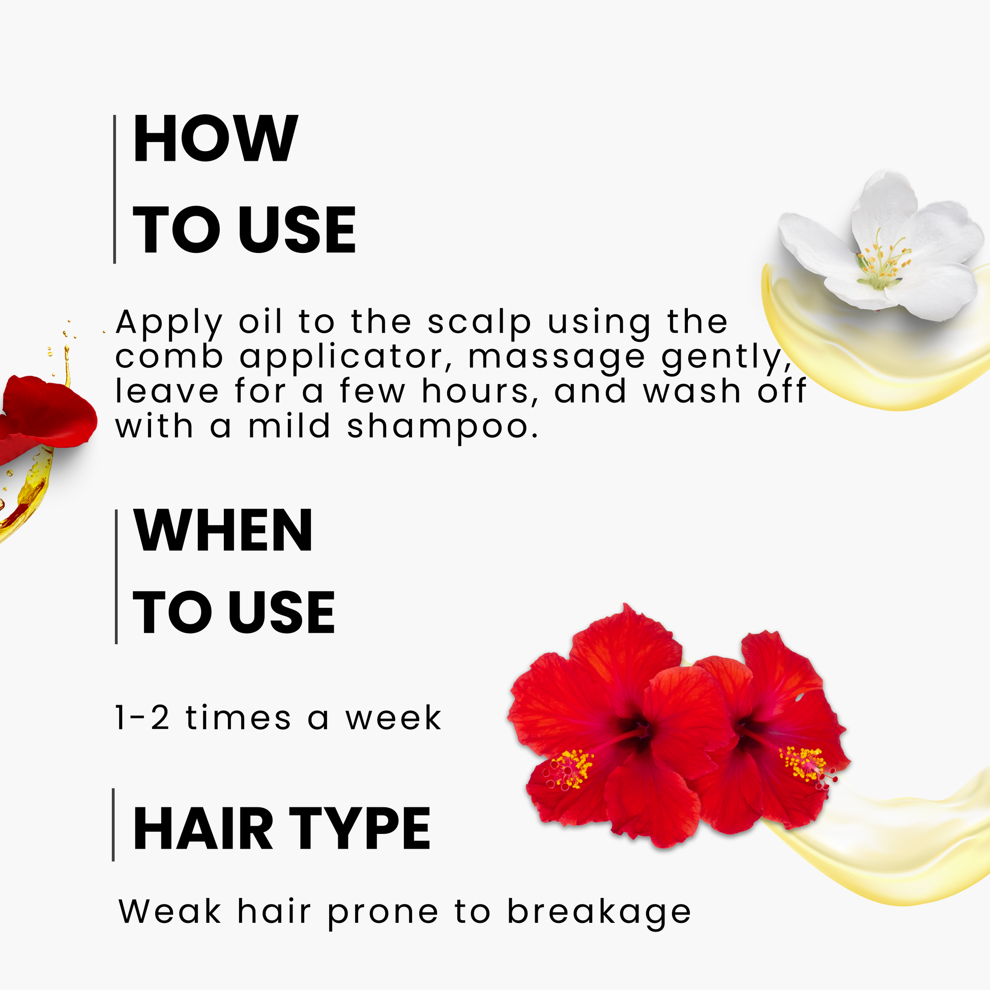 Application: Pour an adequate amount of oil into your palm and apply it to your scalp and hair.