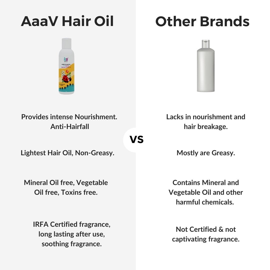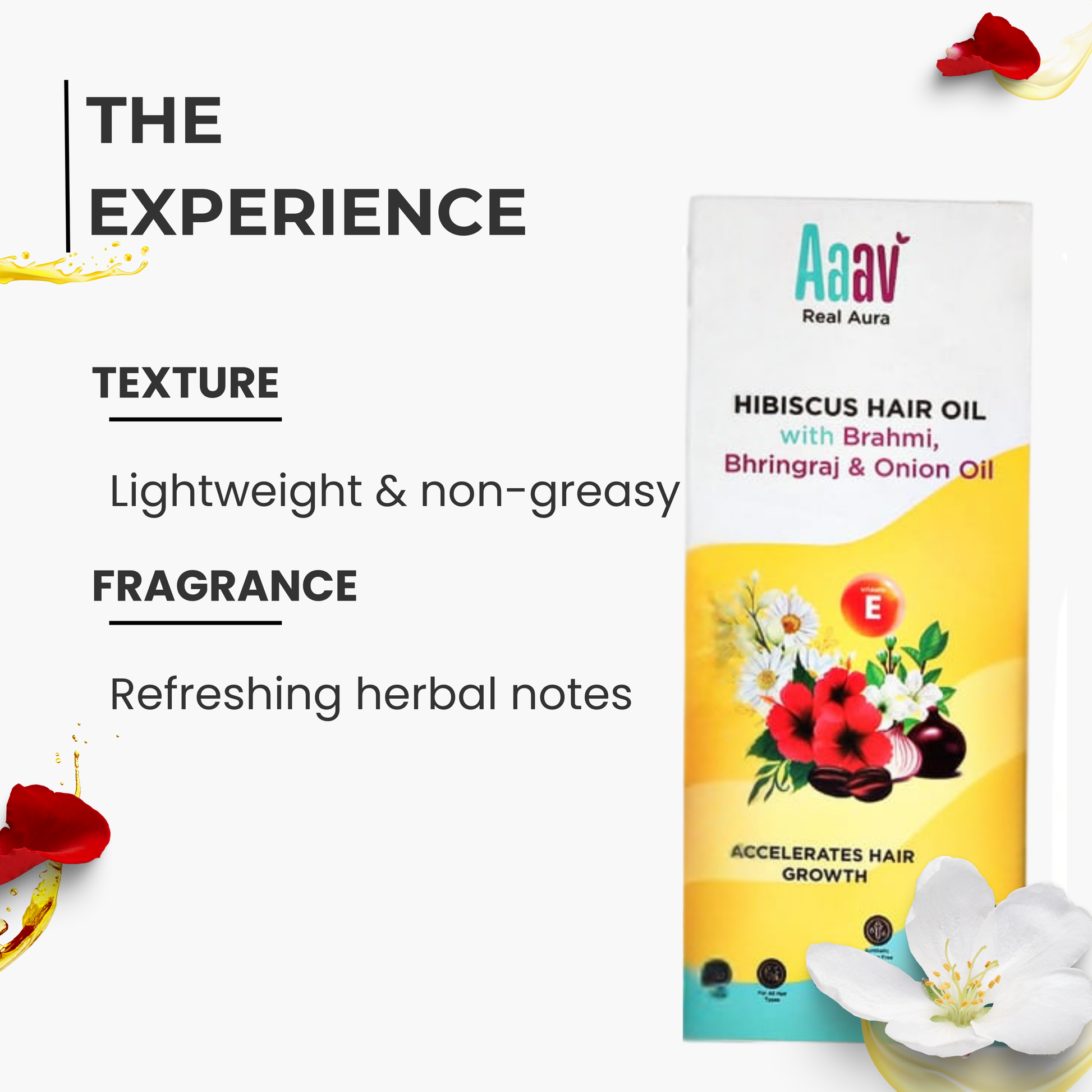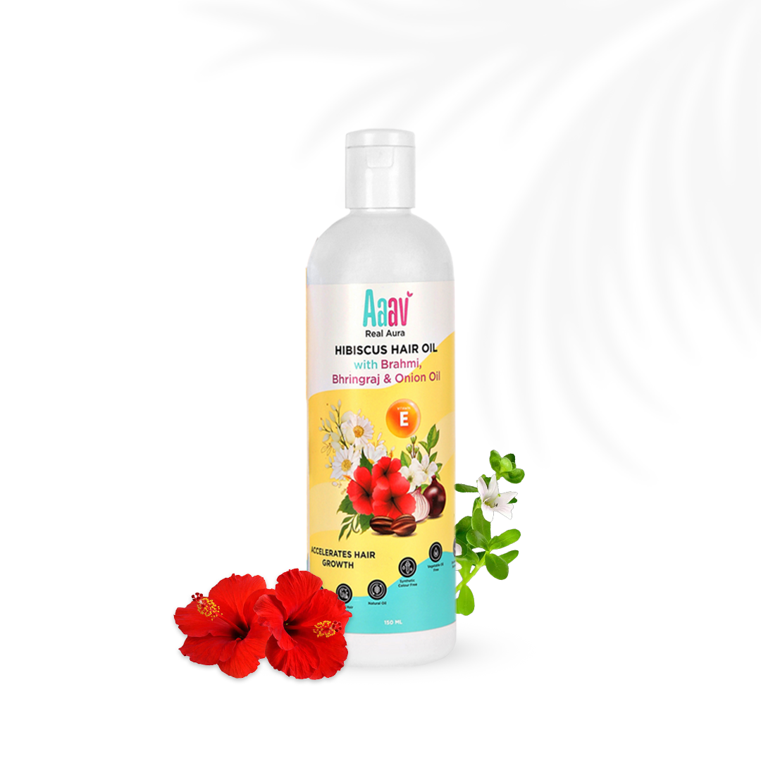 A powerful blend of Hibiscus Hair Oil with Brahmi, Bhringraj, and Onion Oil + Vitamin E, the AaaV hair oil strengthens roots, promotes growth, and reduces hair fall. It nourishes the scalp, adds shine, and keeps hair healthy, thick, and voluminous. The lightest hair oil with non-sticky properties and soothing IFRA certied fragrance adds AaaV hair oil in your daily hair care routine.