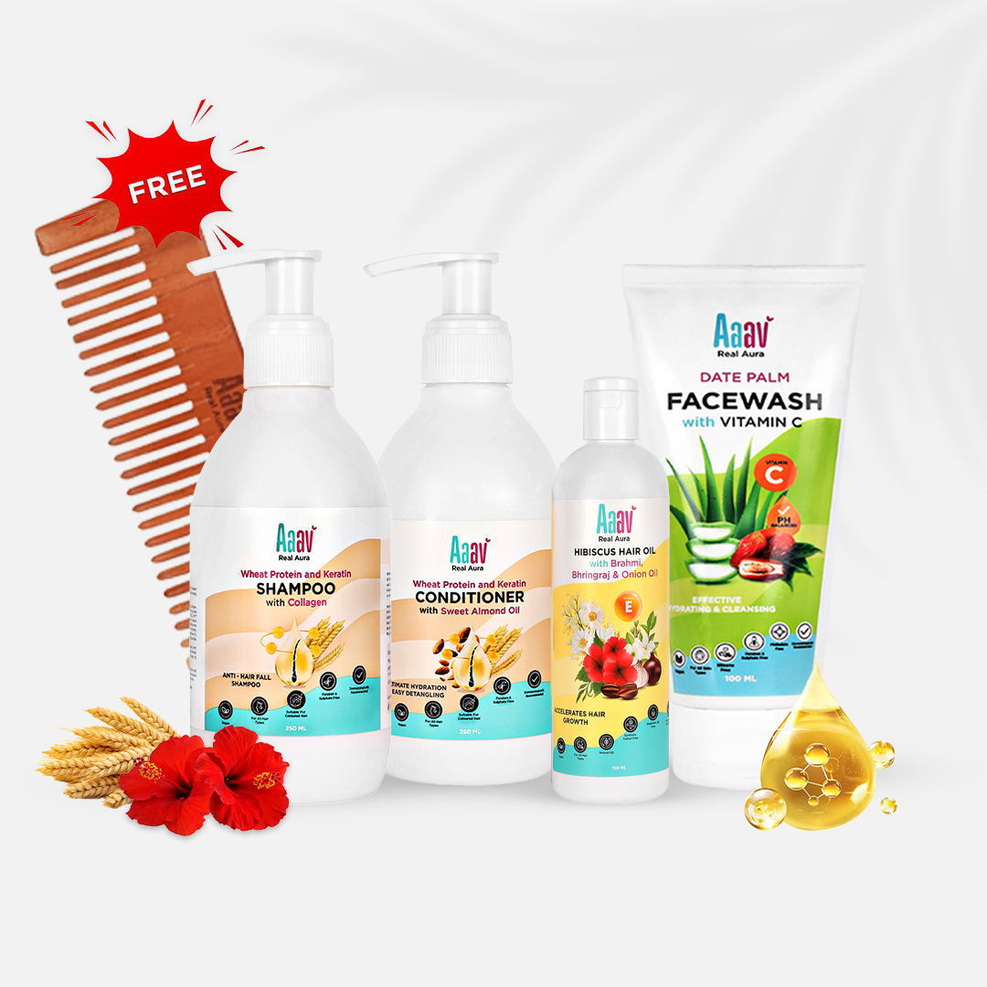 A complete hair care solution featuring AaaV Facewash, Shampoo, Conditioner, Hair Oil and Mahogany-Neem Comb for ultimate nourishment. Deep Cleanses and hydrates your face and Strengthens, hydrates, and revitalizes hair, ensuring smoothness, shines, dandruff free, bouncier free and overall scalp with hair health. Perfect for a well-being, luxurious face care and hair care routine.